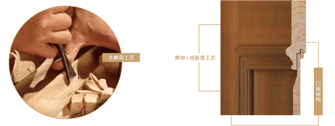 | 榫卯结构: 实木门板榫卯结构拼接,有伸缩空间,防止实木拼接的地方因为实木热胀冷缩挤压变形。 | 实木木板,预留1.6mm水缝工艺,美观精致;预留水缝,降低门板开裂变形几率。 |