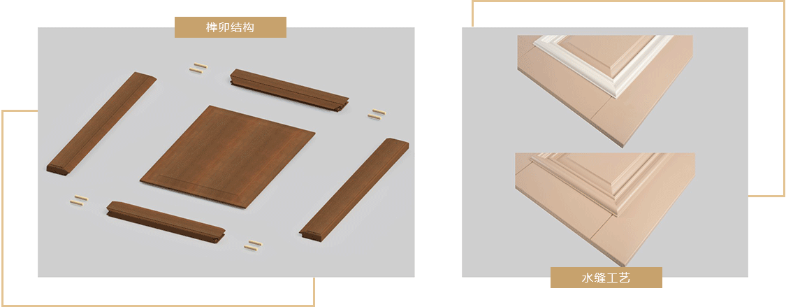 | 榫卯结构: 实木门板榫卯结构拼接,有伸缩空间,防止实木拼接的地方因为实木热胀冷缩挤压变形。 | 实木木板,预留1.6mm水缝工艺,美观精致;预留水缝,降低门板开裂变形几率。 |